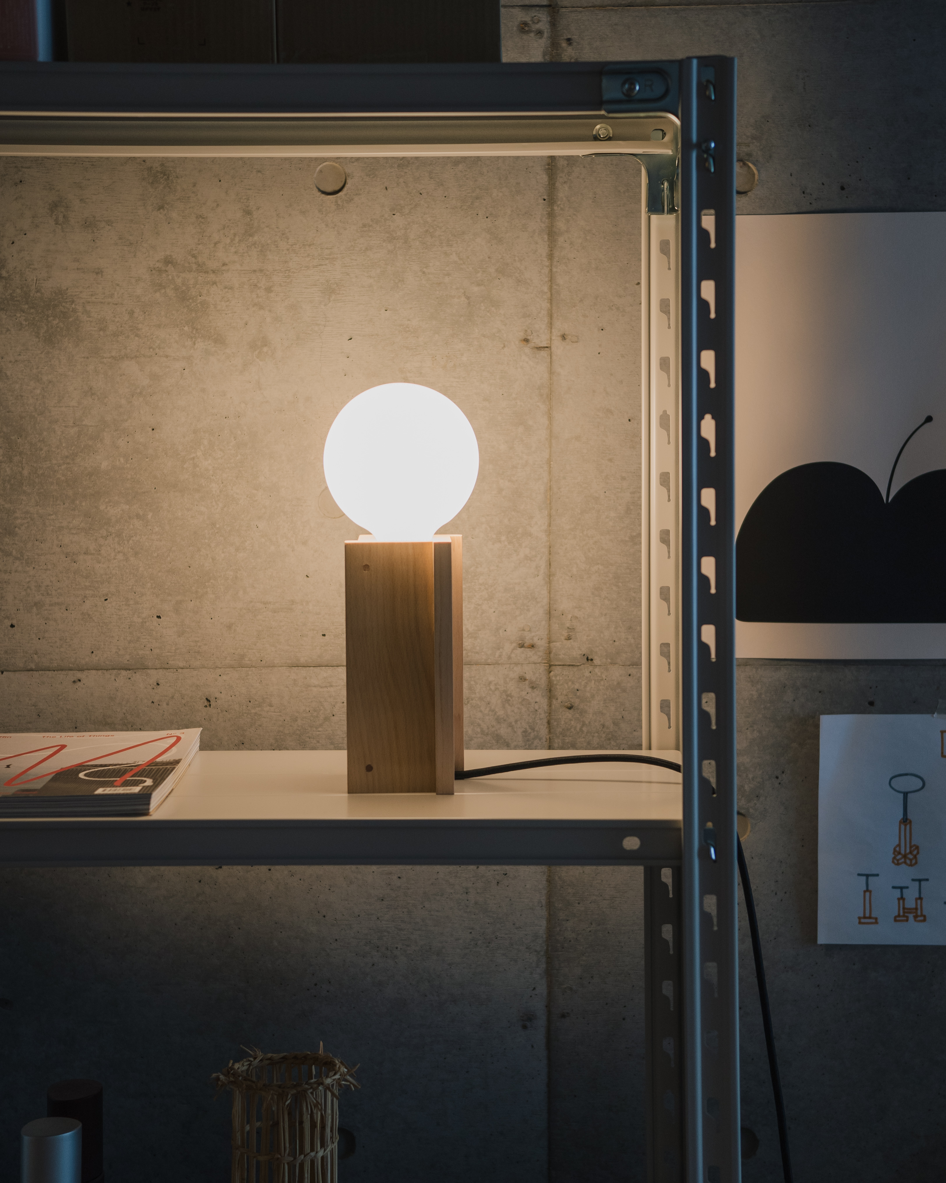 Simple lamp constructed of 4 identical planks assembled with dowels at an offset position. The glass globe is fitted in the socket inside, where the cord coming out from the bottom notch allows the lamp to be placed flush on the surface or installed as a pendant hanging from the ceiling.